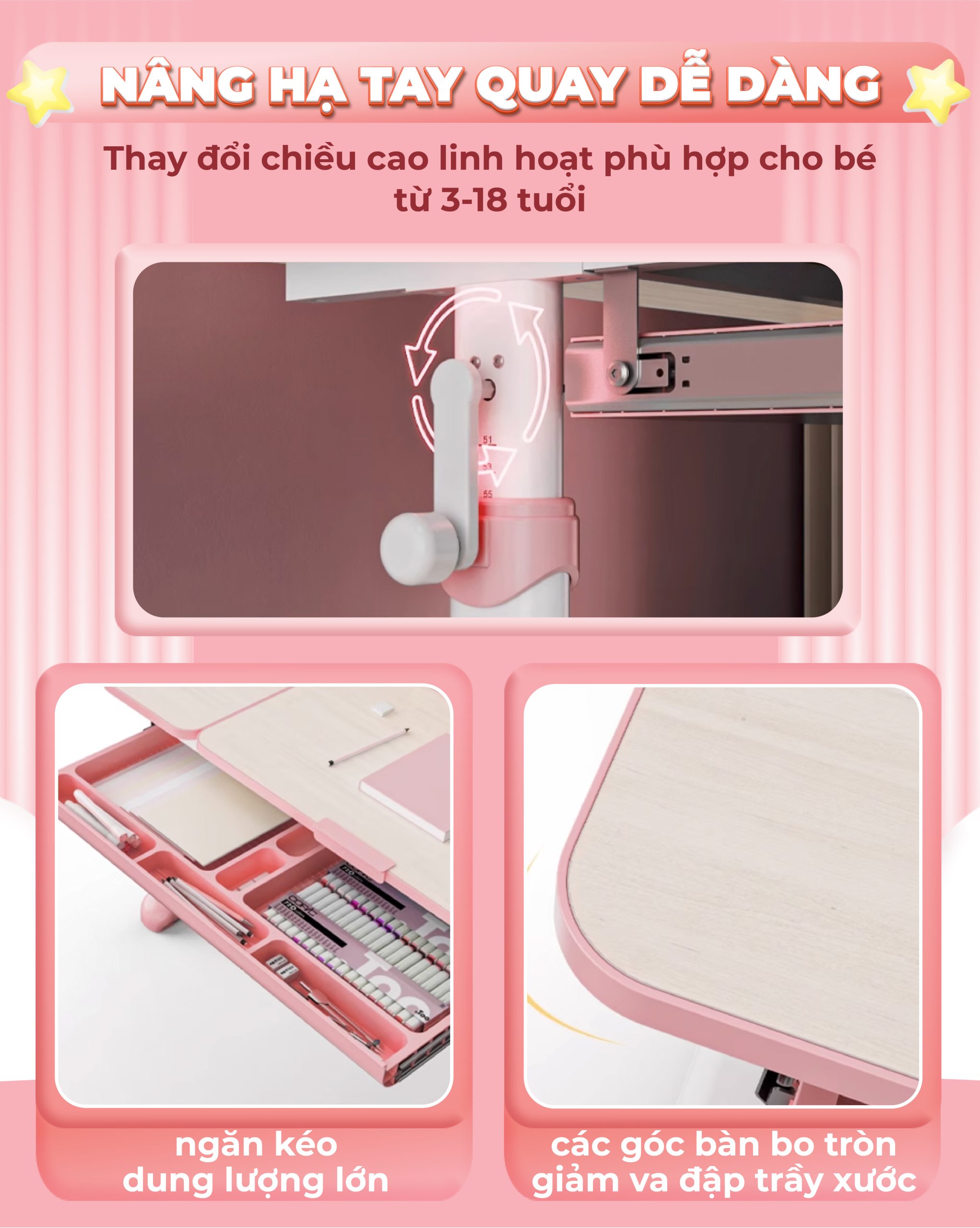 – Chân bàn tối ưu dung lắc bé ngồi học tập trung.